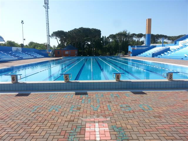 Il complesso è dotato di tribune per 1200 posti, ampio solarium a bordo vasca, area verde di 7000 mq con estese zone ombreggiate da pini marittimi, olmi, tigli.